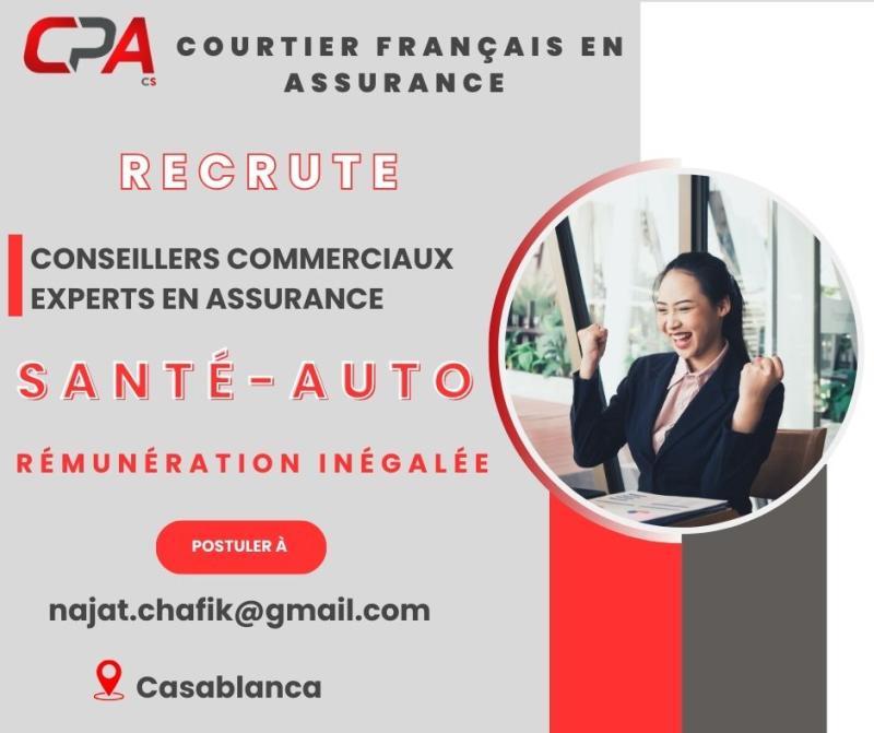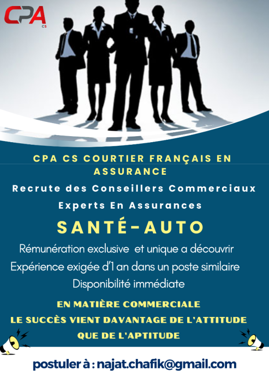 On Recrute à CASABLANCA & RABAT des Conseillers Commerciaux Experts en Assurance/Mutuelle SANT?. Disponibilité immédiate. Pour Postuler : najat.chafik@gmail.com