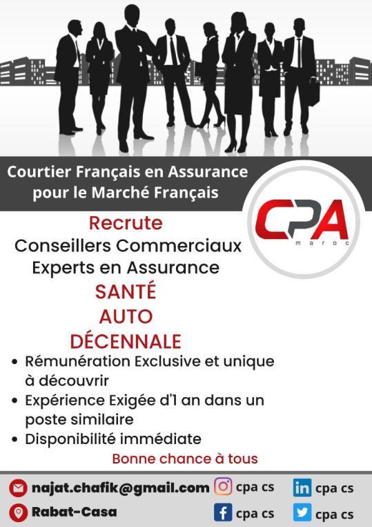 CPA Recrute en CDI à Plein temps à Rabat & à Casablanca "Conseillers Commerciaux Experts en ASSURANCE SANTE & AUTO.