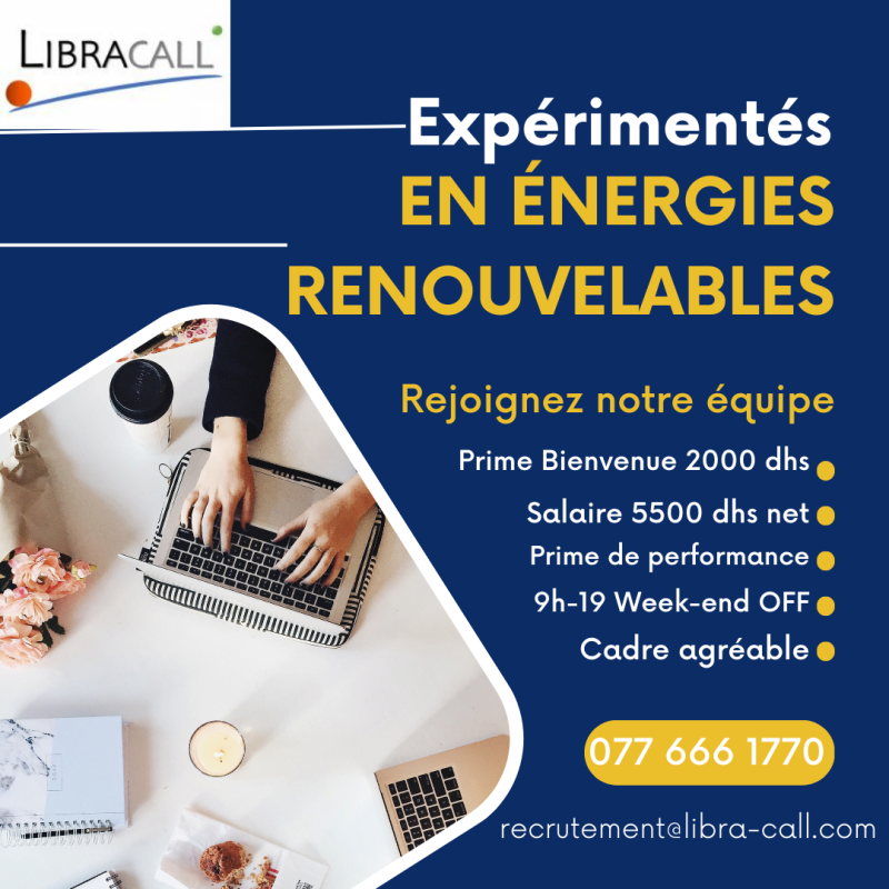 Téléconseillers expérimentés pour la prise de RDV énergies renouvelables a 6000 DH + primes de bienvenue de 6000 dh