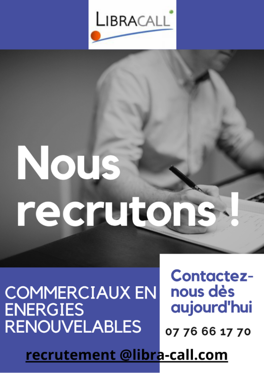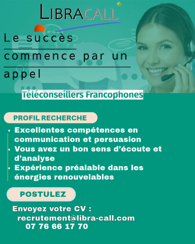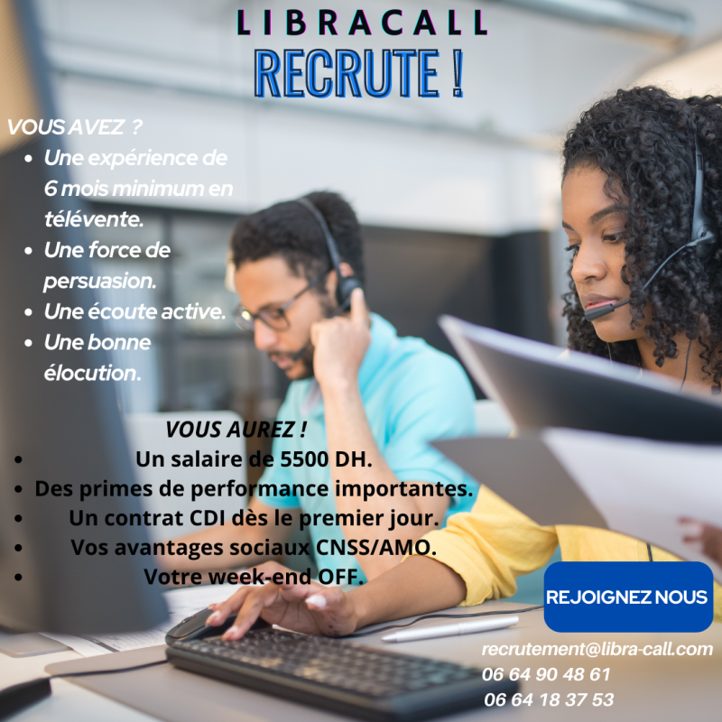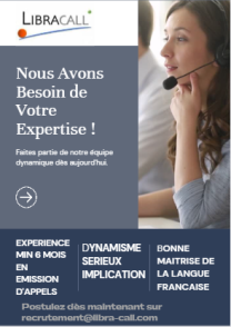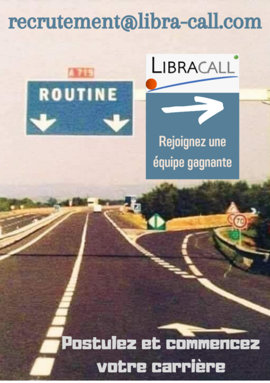 A LA RECHERCHE DE LA STABILITE ET L’EVOLUTION ? BONNE NOUVELLE ! LIBRACALL AGRANDIT SA FAMILLE ET FAIT APPEL AUX EXPERTS EN EMISSION D’APPELS AVEC UN SALAIRE ATTRACTIF !